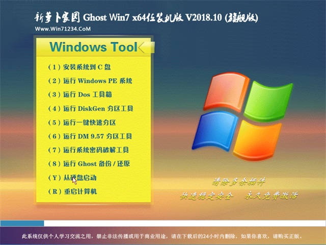 新萝卜家园WIN7x64位装机版系统仅用于进行演示基于万能GHOST的快速部署技术,供装机维护技术人员参考,我们不承担任何技术及版权问题,且不对任何资源负法律责任。所有资源请在下载后24小时内删除。如果您觉得满意,请购买正版!!!