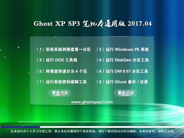 本系统仅用于进行演示基于万能GHOST的快速部署技术,除了系统和光盘中明确标识为原创 作品的软件外,其他的全部文件归属于原版权人所有。我们不承担任何技术和版权问题,没有提供任何技术支持的义务.请勿将本系统用于商业用途。