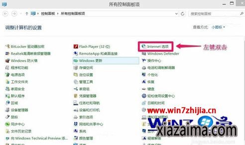 1、首先在win10自由天空专业版系统下鼠标左键双击桌面控制面板(控制面板已经显示在计算机的老毛桃专业版系统桌面上),打开所有控制面板项,再左键双击Internte选项;