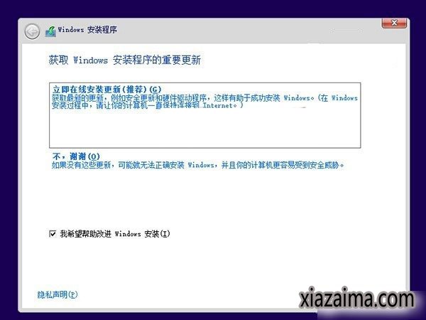 1、运行sources文件夹下的setup安装程序后,就可以见到如下知道的系统安装程序界面了,首先选中【立即在线安装更新(推荐)】,如下图所示。