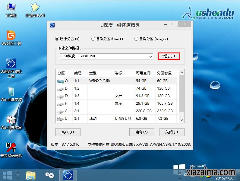 3、进入pe系统会自行跳出u深度一键装机工具,打开“浏览”进行查找存到u盘中windows10系统iso镜像文件包,如图所示:
