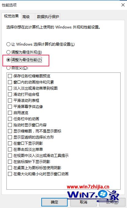 3、在“视觉效果”勾选“调整为最佳性能”,打开“应用”--“确定”退出便可。