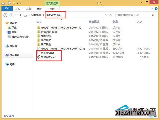 4、把“wIN8.GHO”和“安装系统.exe”两个文件剪切到磁盘根目录下,这里选中放在D盘里;