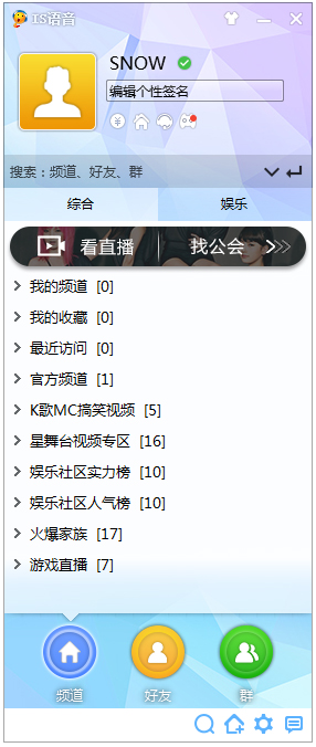 2.登陆上去以后,有综合,娱乐,游戏,收藏等,各自有各自的功能供自己选择使用。在这里可以和一起的语音聊天玩游戏,可以加好友,玩地下城等游戏。