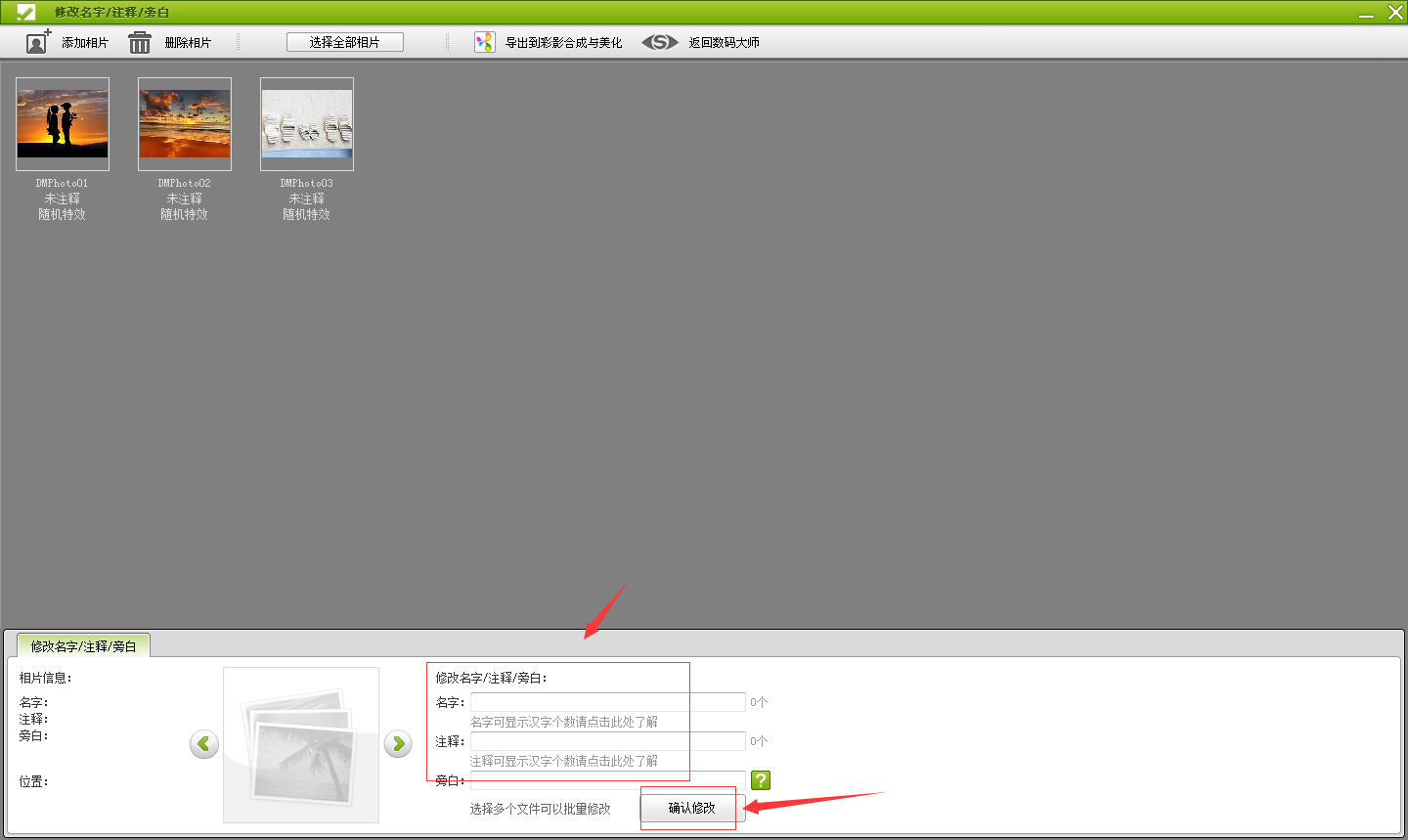 点击“相片文件”选项卡,我们可以看到刚才导入的相片。“修改名字/注释/旁白”按钮能够让我们每张相片添加名字、注释、旁白,如果相片数量多,还可以用ctrl键选中多张相片,进行批量修改。