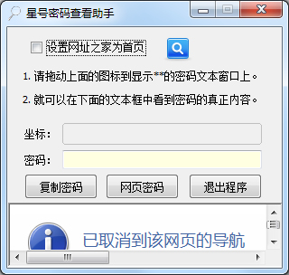 星号密码查看助手软件是一款界面简洁,使用方便,可以在自己忘记某个程序密码时,利用星号密码查看助手快速重新获得。使用时只需将鼠标的光标移到显示星号的密码框中即可。在程序出显示出密码,无需其它操作.支持Windows系统中 显示的星号密码查看支持网页中 显示的星号密码查看,支持框架页面 ,以及可以清楚IE分级密码。