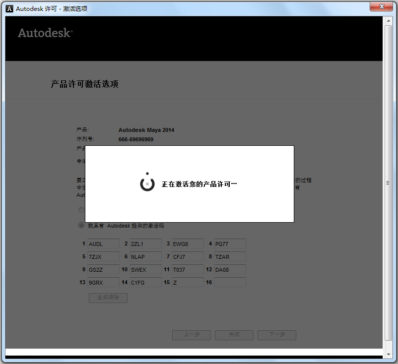 10、最后复制Activation中的激活码至“输入激活码”栏中,并点击下一步完成激活。