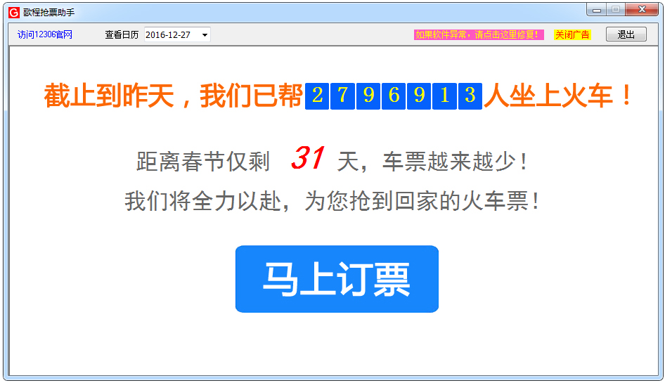 360安全卫士 360杀毒 电脑管家歌程抢票助手是一款火车票抢票软件。使用该软件,你可以设置火车票日期、车次等信息,然后它可以自动帮你抢票,刷新速度快,只要一有对应车票,立马抢到手。有了歌程抢票助手,你再也不用担心买不到回家的火车票了。