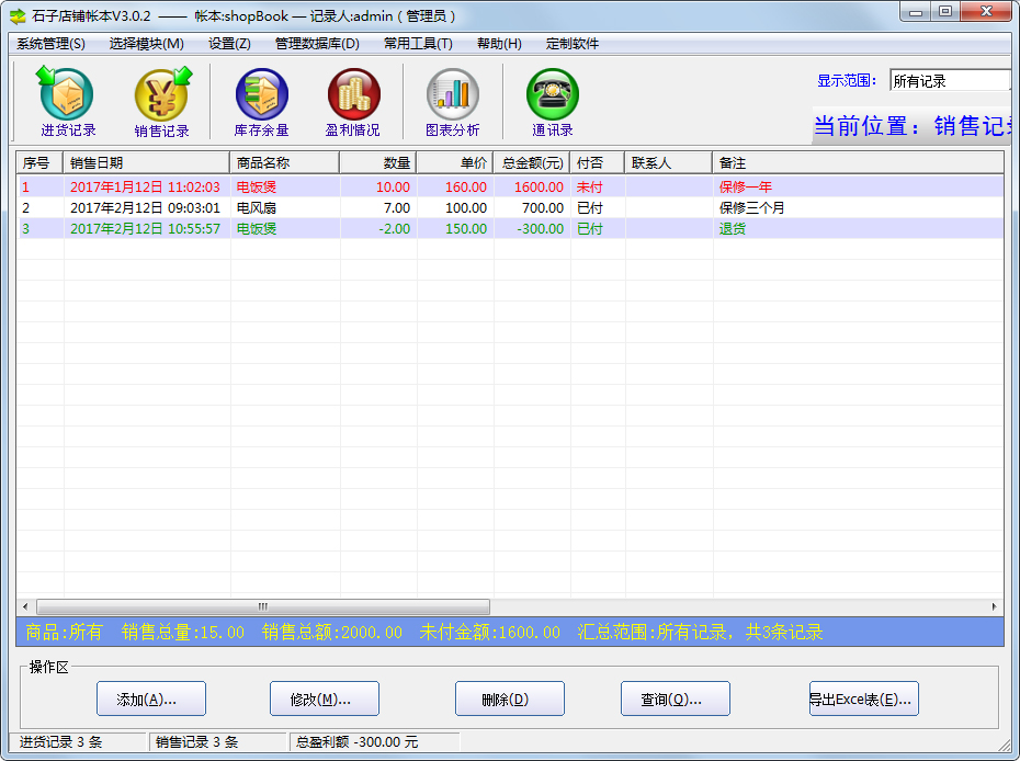 1、进销记录:对进销商品的数量、金额进行添加、修改、删除、查询。