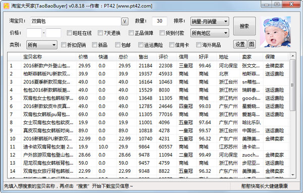 淘宝大买家(TaoBaoBuyer) 是一款方便淘宝买家对淘宝的海量宝贝中的价格、快递费、已卖出数量、卖家信用、卖家好评率等信息进行搜索、比较、排序的绿色小软件。.....