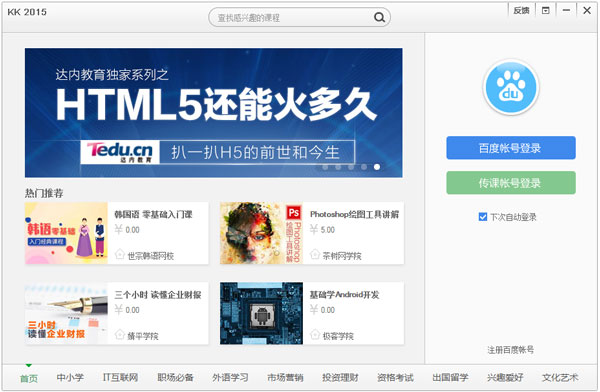 百度传课KK测试版是一款带有IM功能的在线互动学习客户端软件。百度传课KK主要用于在线教育,是与传课网关联使用的PC客户端软件。百度传课KK通过提供包含语音、视频、PPT课件、IM交流.....
