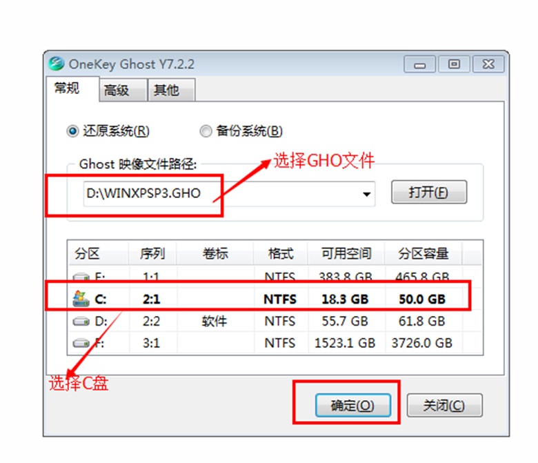 5、双击"安装系统.EXE",选择"C盘"(C盘为系统磁盘),插入映像文件"WINXPSP3.GHO",接着点击执行,如图所示: