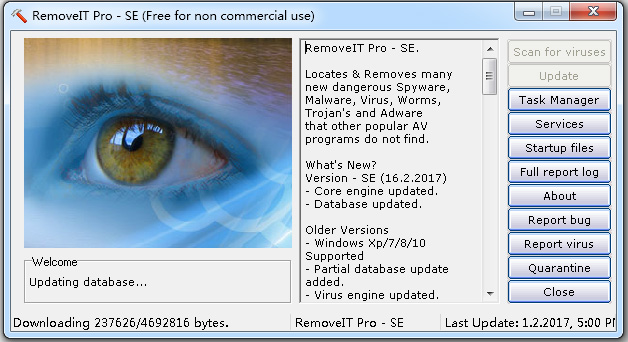 RemoveIT Pro是一款用于查杀病毒、蠕虫、广告、间谍等恶意程序的小工具,此外该软件还提供了诸如进程管理、服务管理等安全辅助功能,由于该软件提供针对个人用户完全免费的版本,因此感兴趣的朋友可以一用!由于该软件的扫描功能不支持用户自定义任务,也不支持右键扫描功能,并且病毒检测率一般,笔者认为该软件只可用作辅杀工具,建议在安装有专业反病毒软件的基础上安装使用该软件。